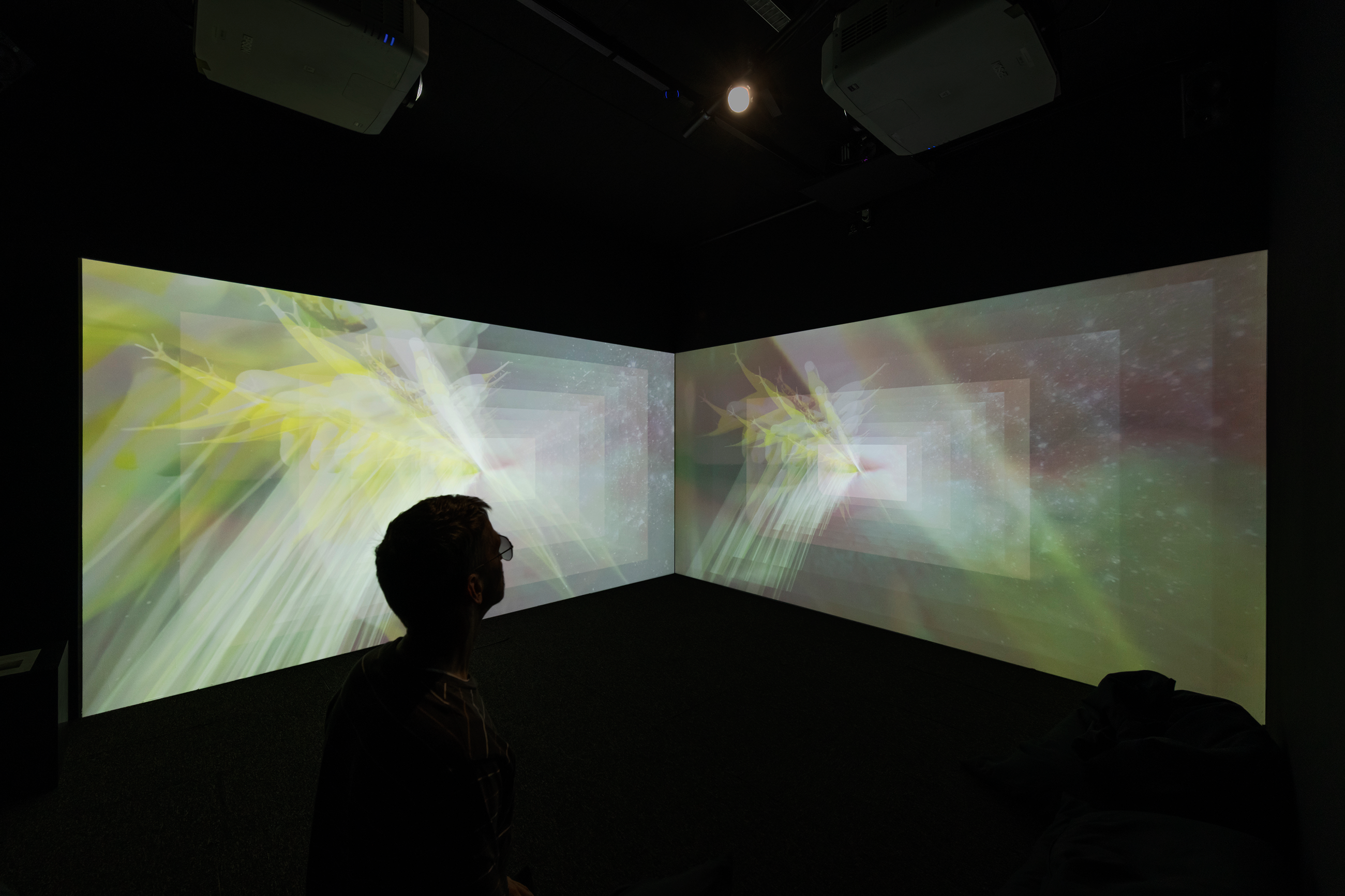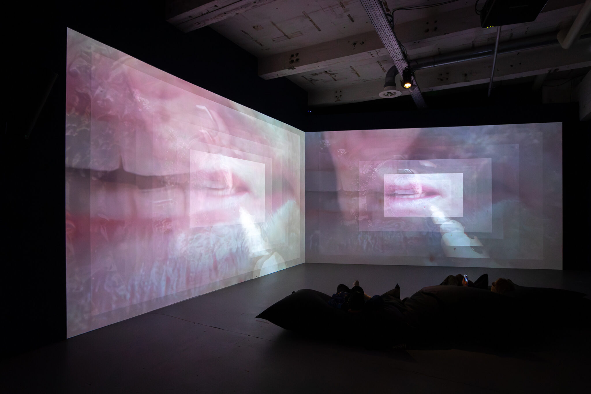 On the projection screens, AI generated videos of slimy, natural, cosmic and bodily forms – oozing, unfolding, unfurling – are layered with close ups of Heaney’s mouth and glimmers of a live webcam feed of the audience, inviting them to think about the entangled, unboundaried and fluid nature of existence.