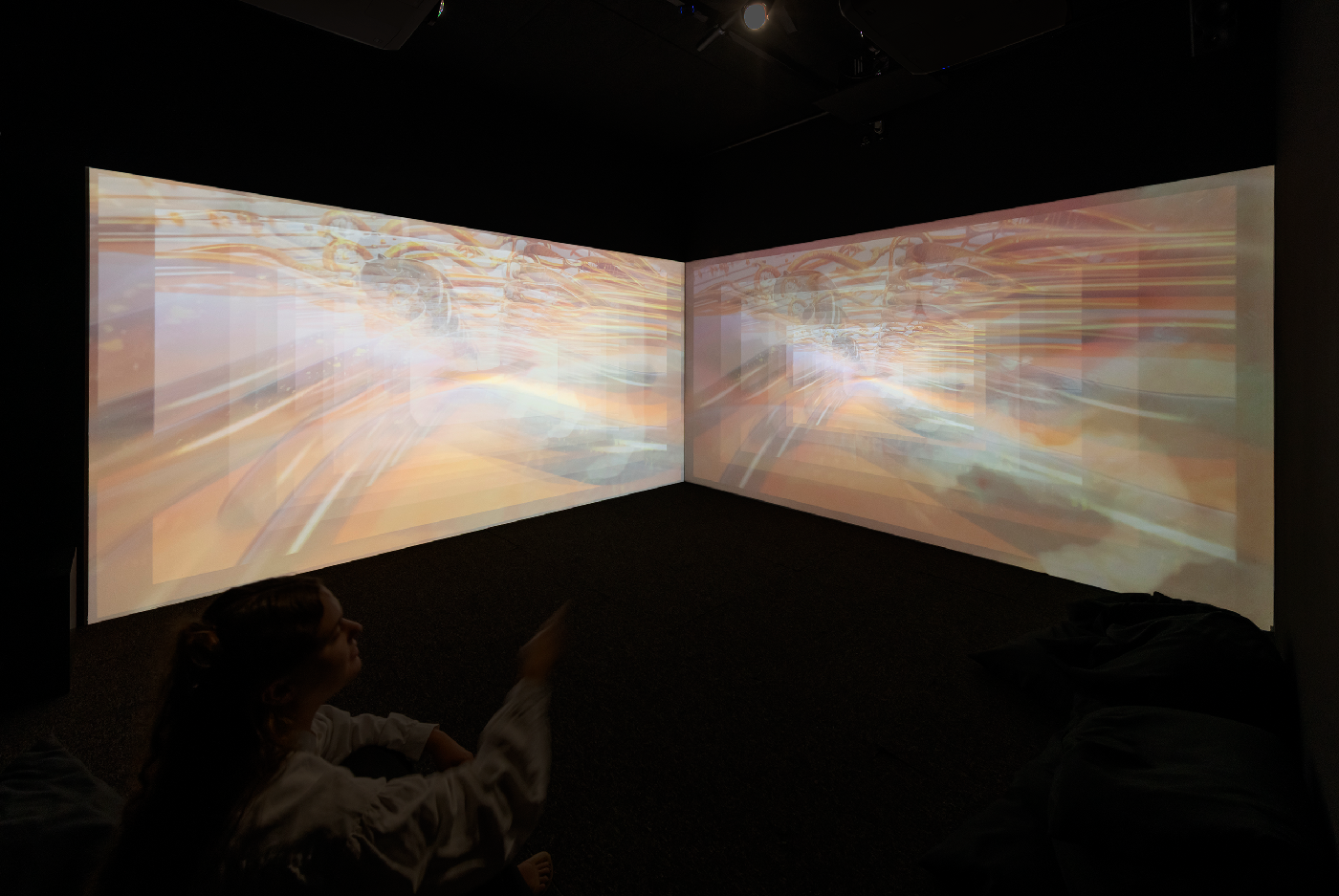 The layers pulsate in and out of being – becoming more or less visible – determined by the wave like patterns of quantum entanglement from one of IBM’s 5 qubit quantum computers, suggesting an extra-dimensional, shapeshifting & interconnected lived experience.